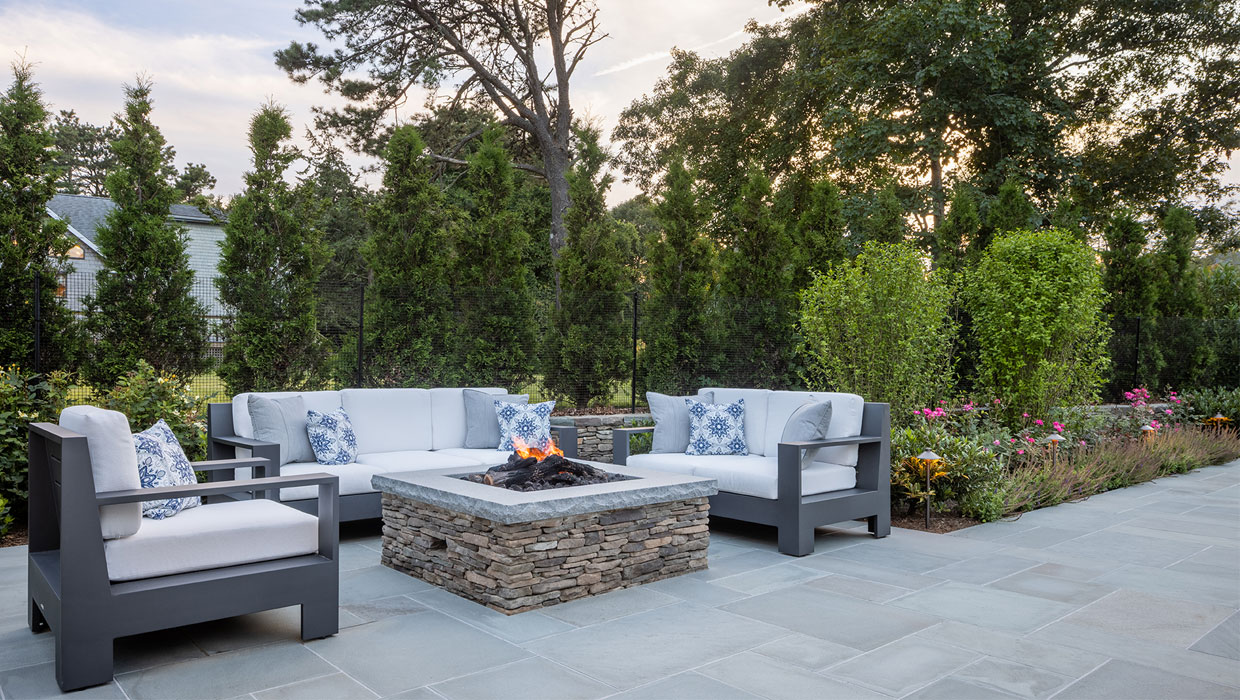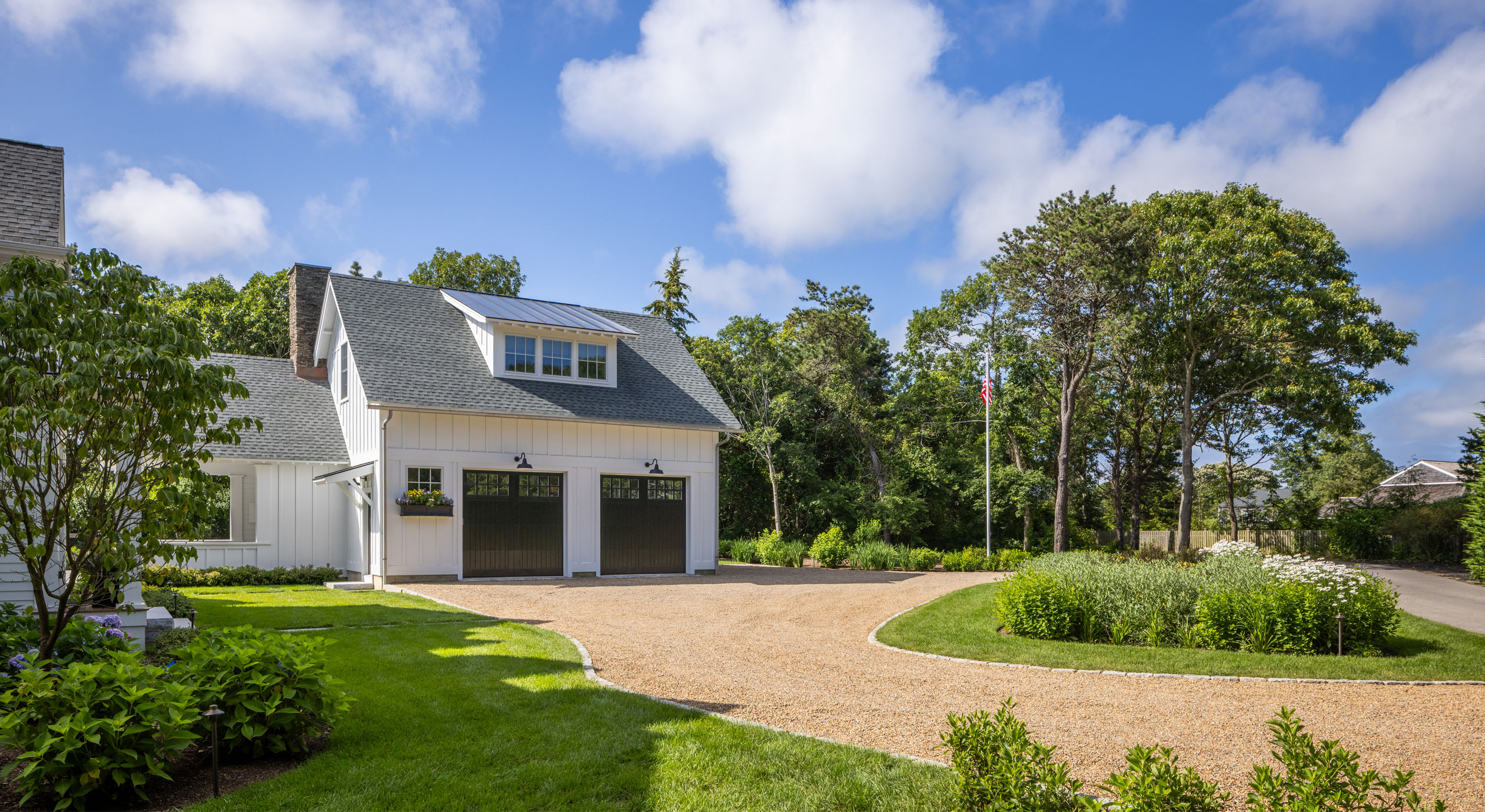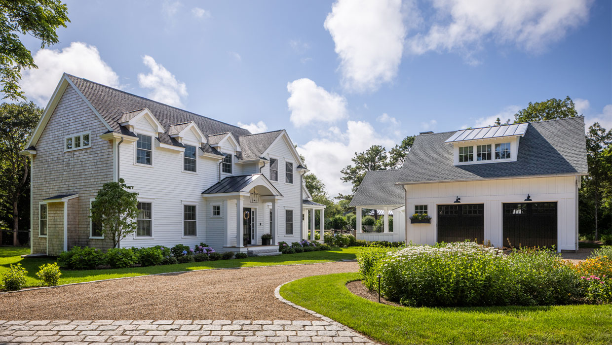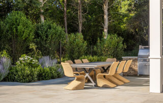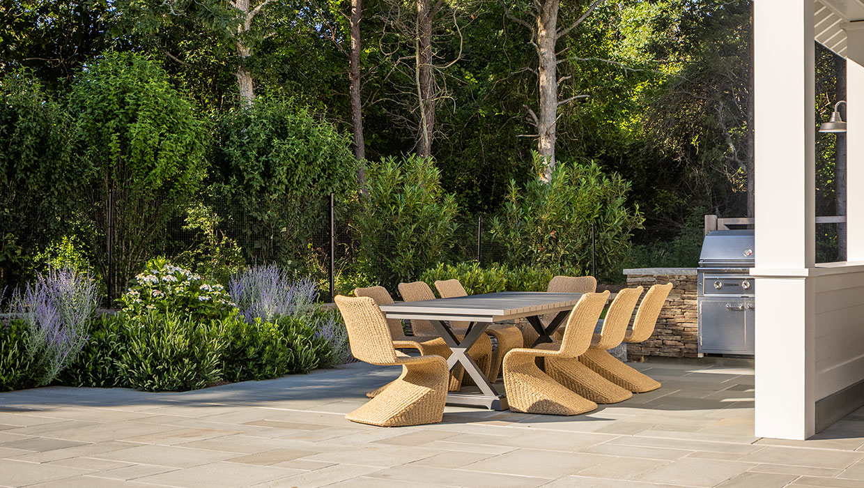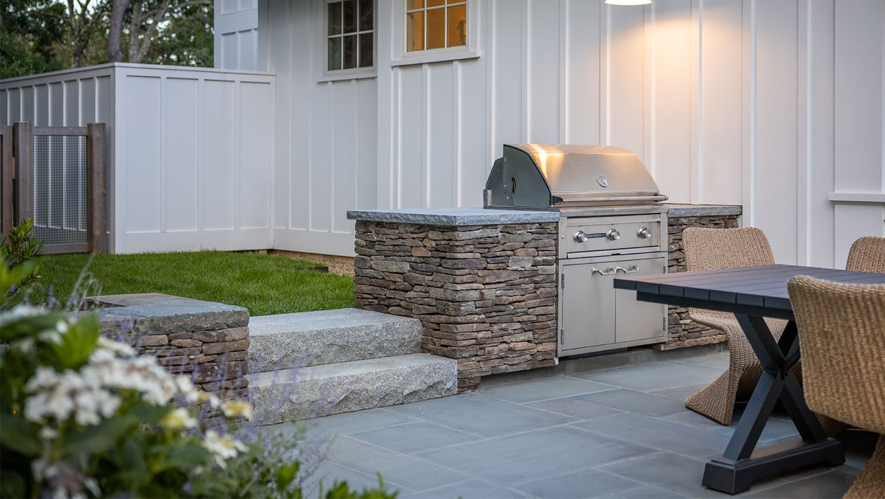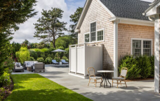 The client was building a new garage/pool barn and main house addition at their Edgartown summer residence. The 0.5-acre lot required considerable landscape planning to site the pool, pool patio, fire table, masonry outdoor kitchen, driveway entry/parking, pool fencing and gates, and plantings.