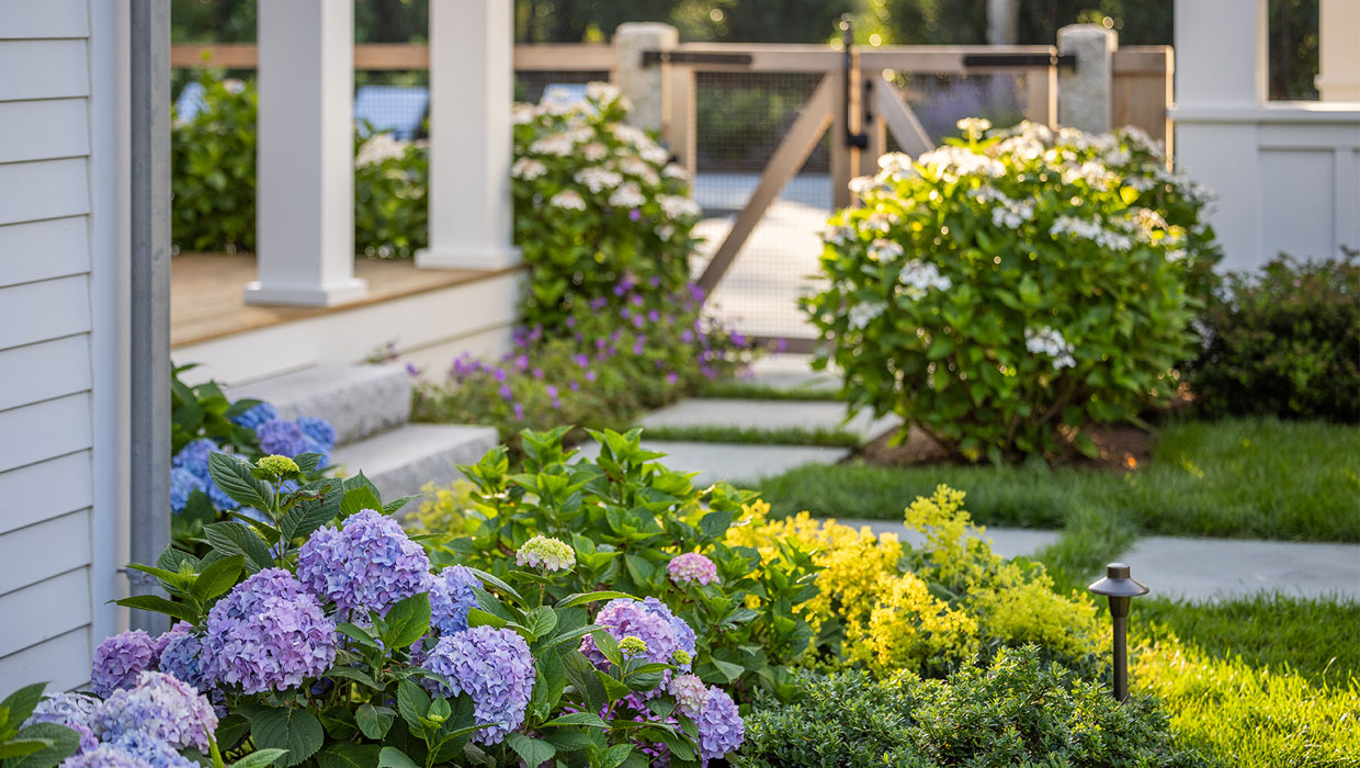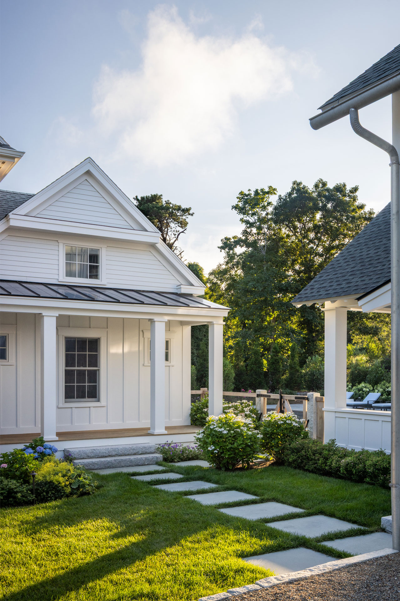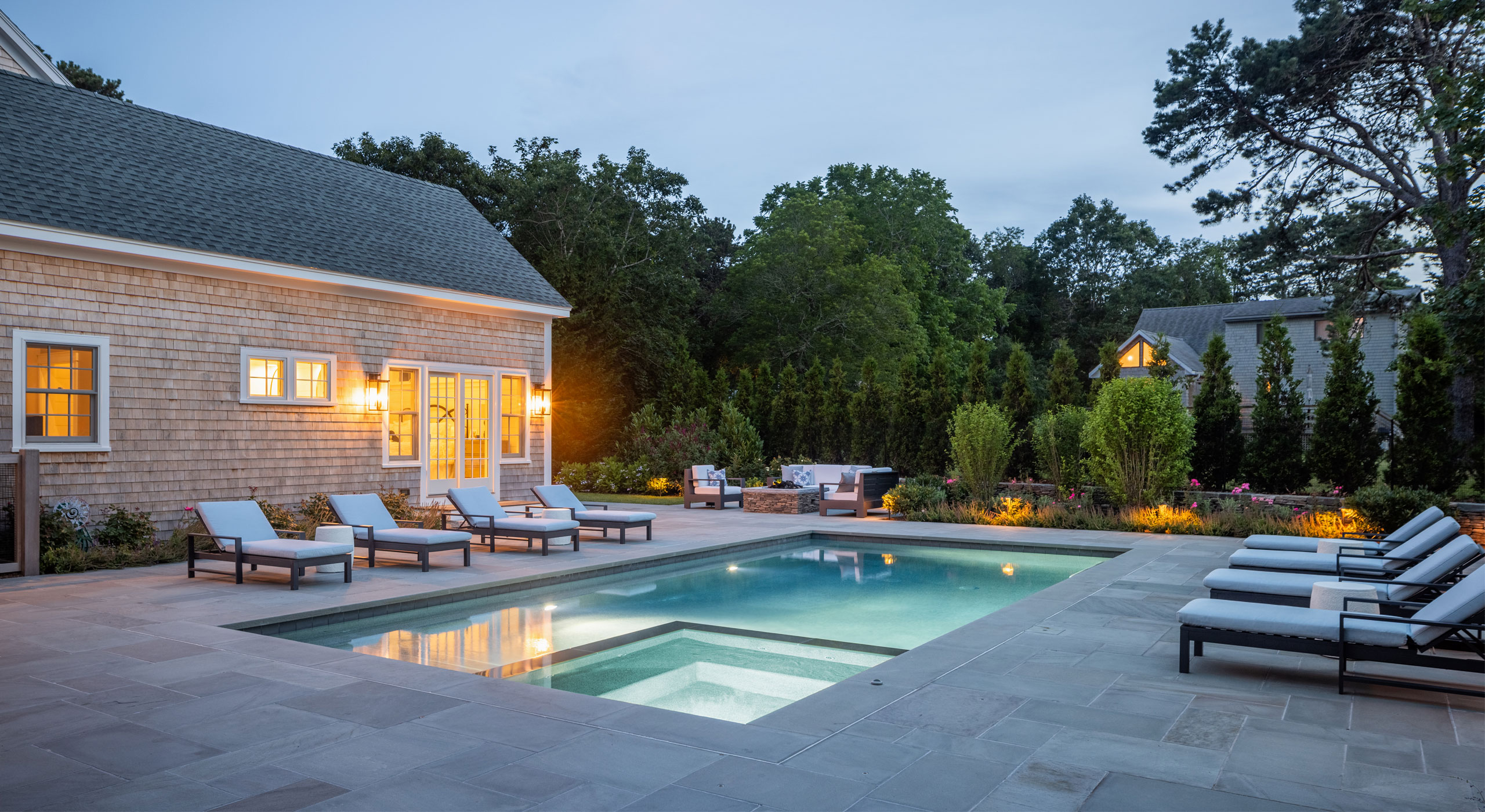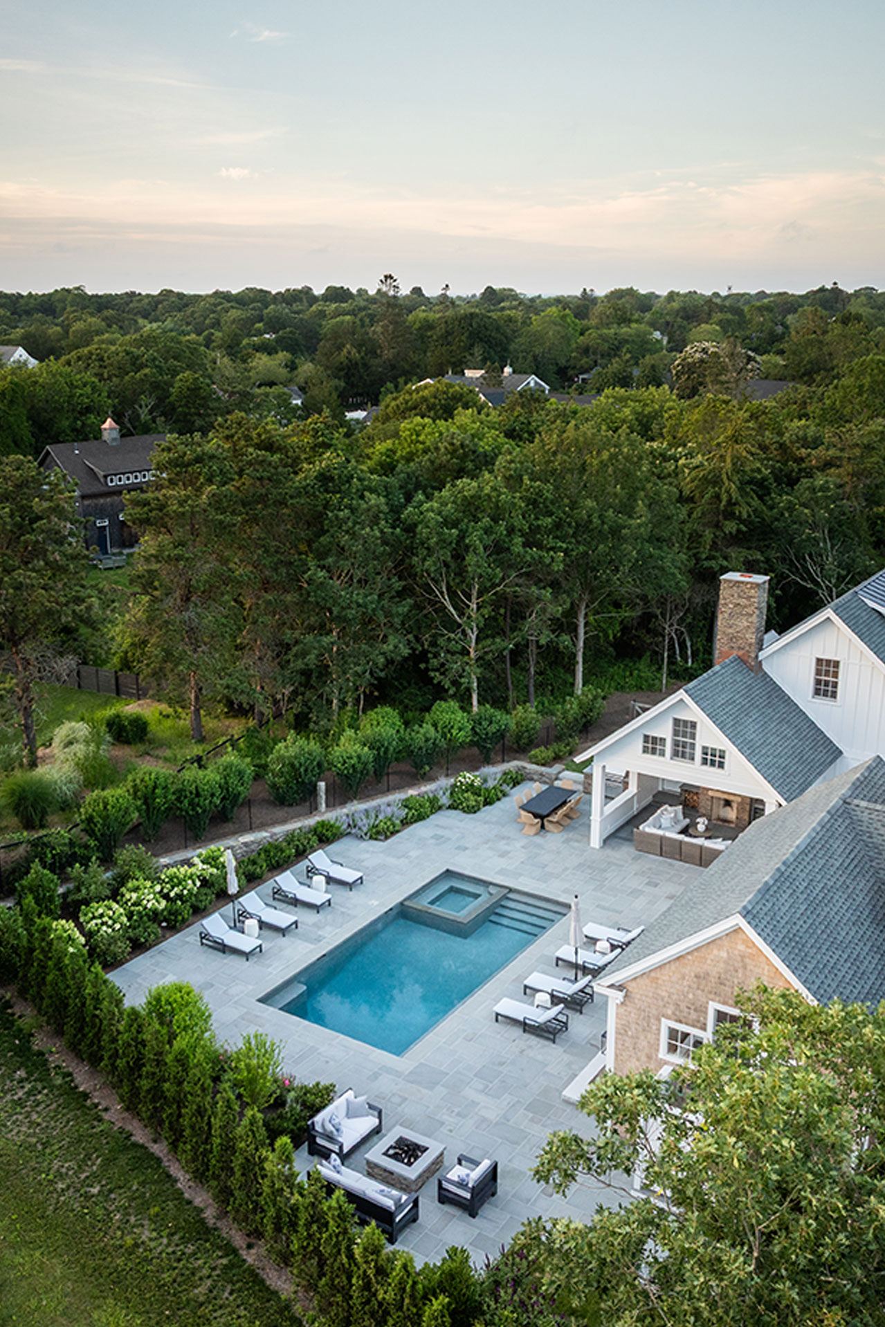 A precise design strategy and process was necessary to address the space limitations. The first critical step was to establish the correct orientation of the buildings to the pool, optimizing the spatial relationship of the main house, pool, and pool barn. Ultimately, the proper design decision was made to orient the three structures with a harmonious orthogonal relationship. The second step was to push the Pennsylvania flat fieldstone retaining wall, required to meet the adjacent property elevations, to the edge of the property. This decision maximized the amount of usable, flat area. The small backyard was transformed into an expansive and open livable space. The third major design decision was the planting strategy. A layer of plantings was located between the bluestone pool patio pavement and the fieldstone wall. This vegetation would break up the hardscape. The front driveway planting island is located centrally, between the two buildings, anchoring the front entrance with a cottage-garden style array of flowering shrubs and perennials.