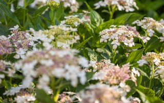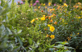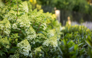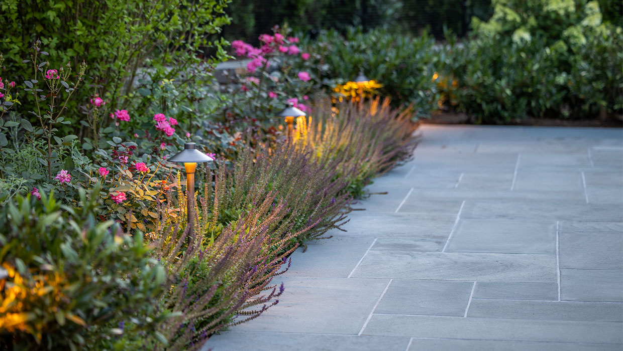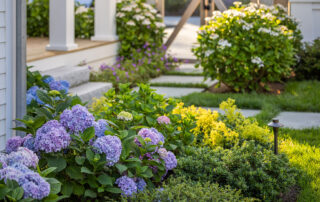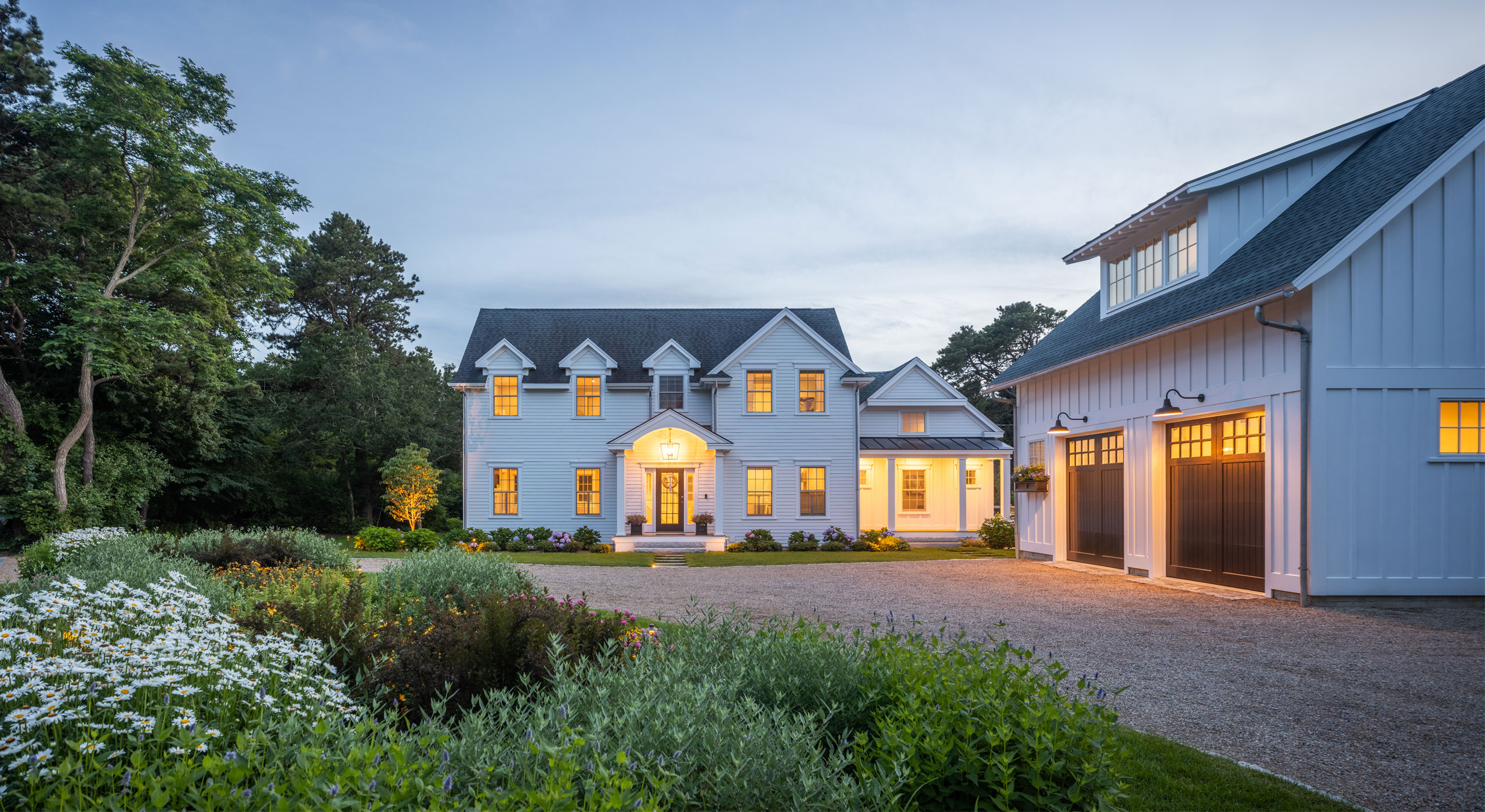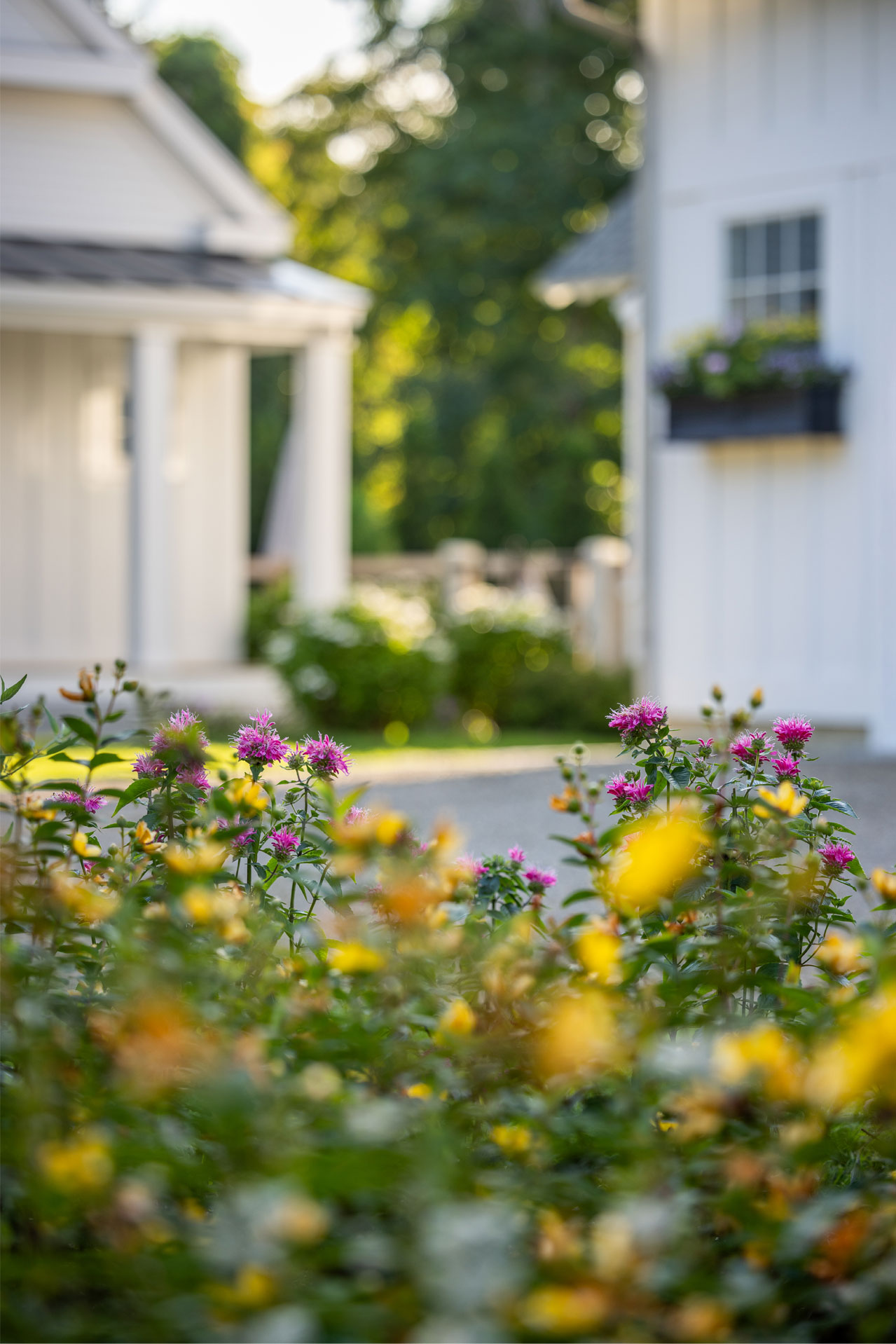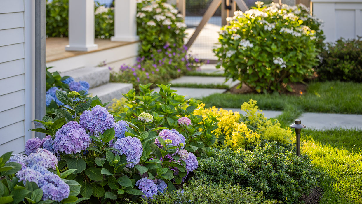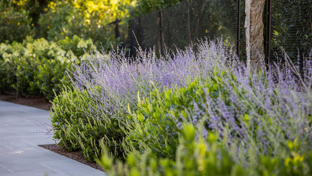 A precise design strategy and process was necessary to address the space limitations. The first critical step was to establish the correct orientation of the buildings to the pool, optimizing the spatial relationship of the main house, pool, and pool barn. Ultimately, the proper design decision was made to orient the three structures with a harmonious orthogonal relationship. The second step was to push the Pennsylvania flat fieldstone retaining wall, required to meet the adjacent property elevations, to the edge of the property. This decision maximized the amount of usable, flat area. The small backyard was transformed into an expansive and open livable space. The third major design decision was the planting strategy. A layer of plantings was located between the bluestone pool patio pavement and the fieldstone wall. This vegetation would break up the hardscape. The front driveway planting island is located centrally, between the two buildings, anchoring the front entrance with a cottage-garden style array of flowering shrubs and perennials.