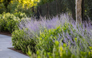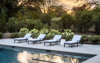The building location, property line boundaries, and property setbacks posed a very tight space challenge. The landscape master plan needed to maximize the back yard space to accommodate a pool with a deep end and spa, as well as a masonry fire table and masonry outdoor kitchen. Planning also considered placement of outdoor furniture and comfortable circulation throughout the patio area. A new septic system in the front entry driveway limited the options for tree planting. Rather, a sizeable garden with low plantings would be needed to soften the buildings and gravel driveway.